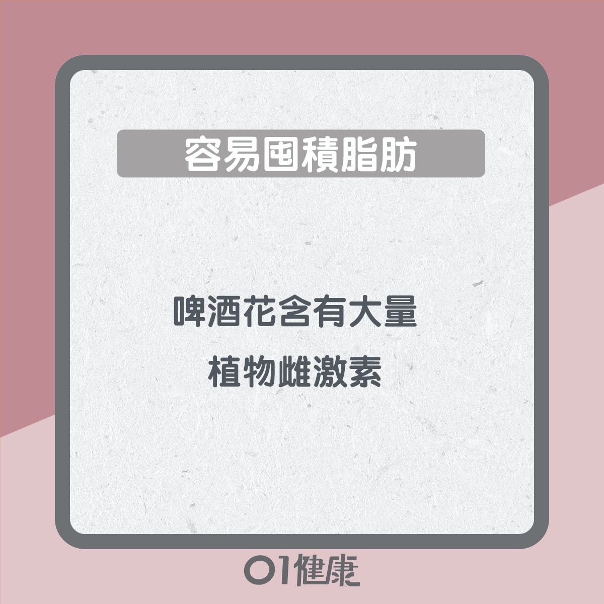啤酒花,含大量植物雌激素,這些植物化合物會模擬體內的雌激素(Estrogen),產生相同的作用,而雌激素本身是利於脂肪囤積的荷爾蒙,所以有些人認為,啤酒中的啤酒花,可能會導致男生體內的荷爾蒙產生變化,進而增加了腹部脂肪囤積的機率。但目前這個說法,科學界仍然沒有清楚的原理解釋。
