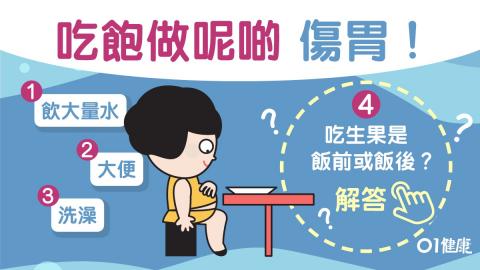 許多人會認為,在飯後應該要坐著休息,避免胃下垂,但其實坐著的時候,因為腹部的脂肪、肉去擠壓胃部,反而讓腸胃沒辦法好好消化。台灣三軍總醫院營養師王秀惠說,飯後散步10分鐘,更能促進蠕動、幫助消化,而每天固定運動30分鐘,也是刺激腸胃蠕動的方式,增強胃部的消化能力。