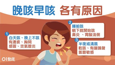 這種通常是躺下沒多久之後就開始咳嗽,所以咳嗽的症狀是跟「平躺」有關,多半來自2種原因,一個是鼻涕倒流,一個是胃酸倒流(胃食道逆流)。鼻涕倒流是來自於過敏性鼻炎,或是鼻竇炎等,因為躺下之後鼻涕順著往後走,經過咽喉的時候引起咳嗽,會有一些比較清澈的痰,但治療要從鼻炎開始。