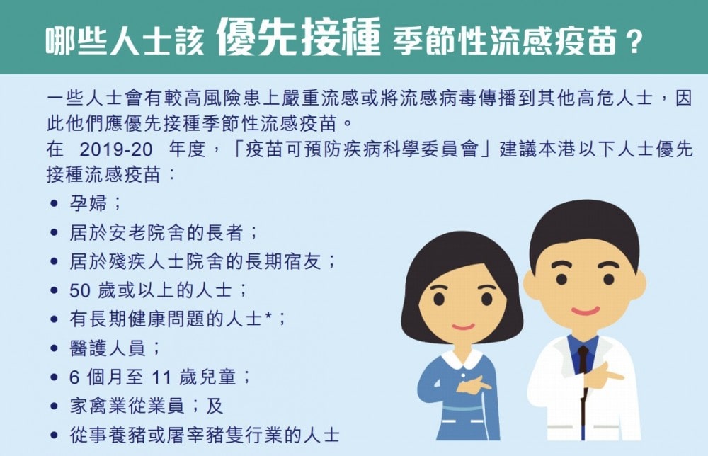 一些人士會有較高風險患上嚴重流感或將流感病毒傳播到其他高危人士,因 此他們應優先接種季節性流感疫苗。 在 2019-20 年度,「疫苗可預防疾病科學委員會」建議本港以下人士優先接種流感疫苗: