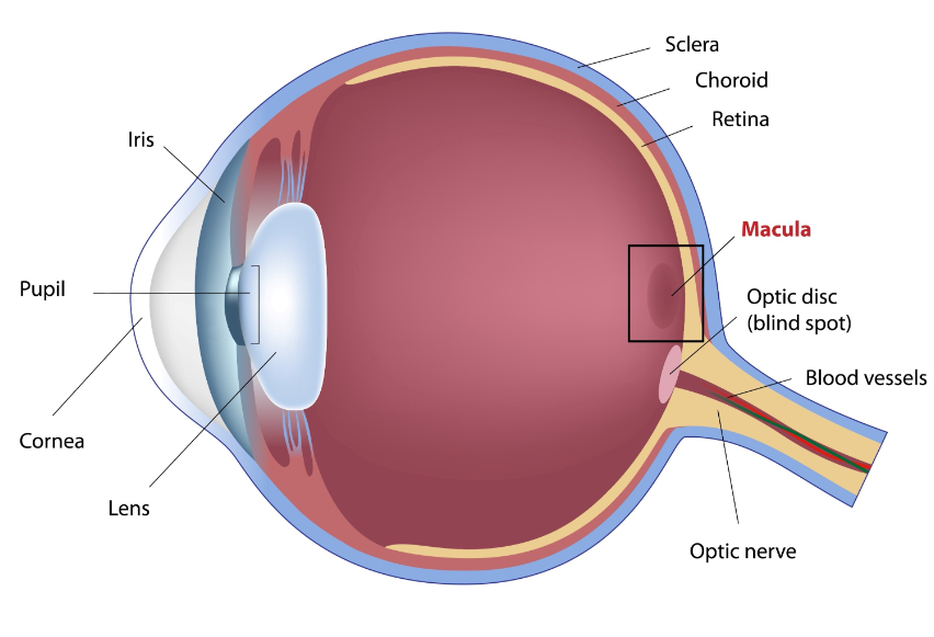 人體眼球視網膜中心區域,備有大量的感光神經細胞,亦即是黃斑區域,是視力最敏銳的部份,負責精細視物及分辨顏色。隨年紀增長,黃斑區域退化,令感光神經細胞無法運作,繼而影響視力,會出現視力下降、物件扭曲變形、色覺異常等狀況。