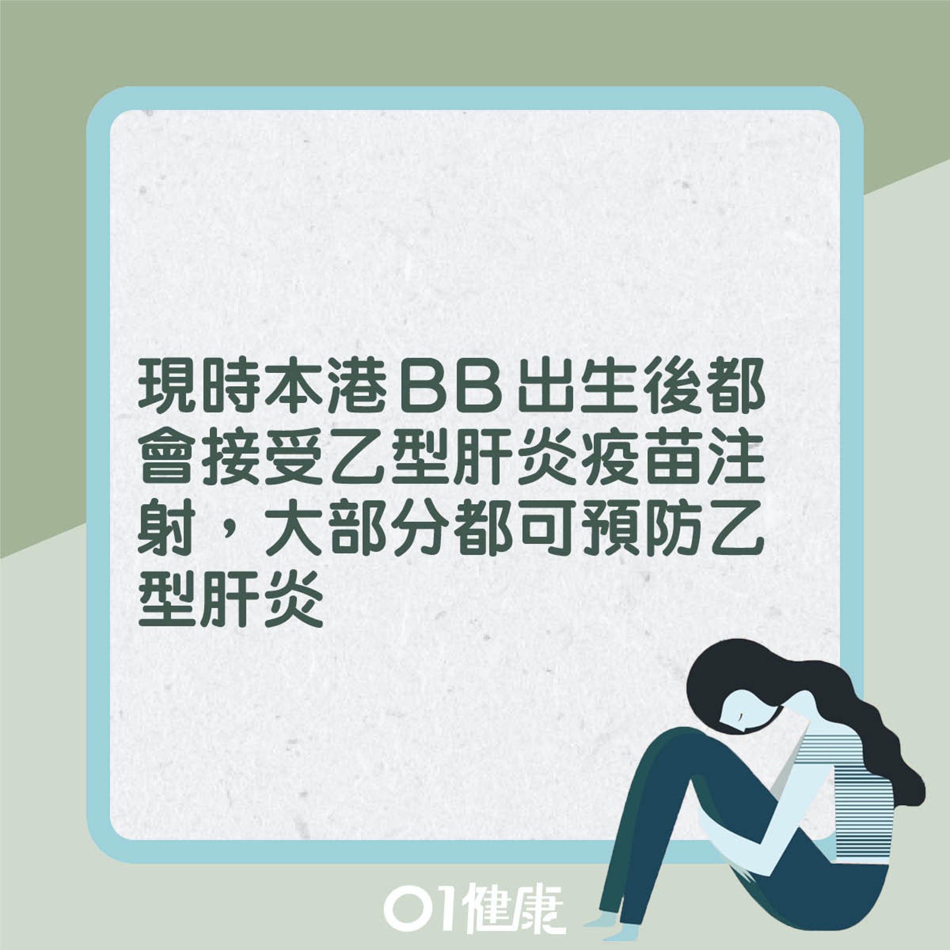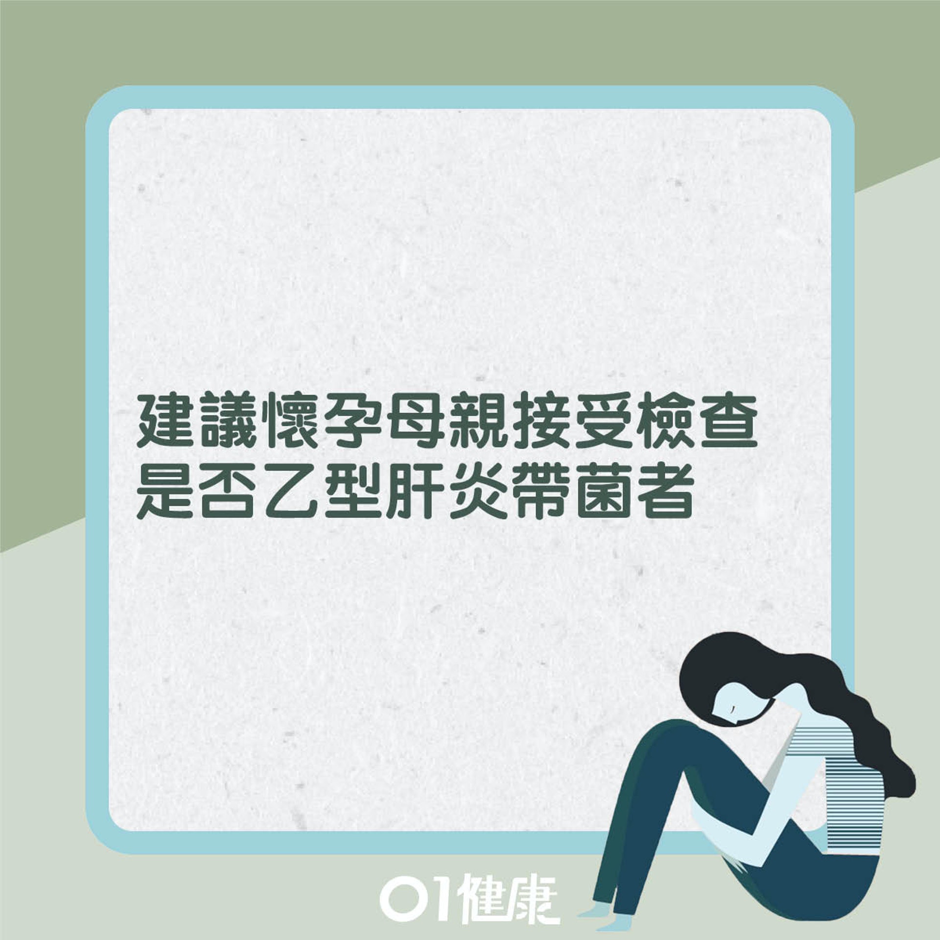 此外亦建議懷孕母親接受檢查是否乙型肝炎帶菌者,若是的話,BB出生後除了要注射乙型肝炎疫苗,也可能要注射丙種球蛋白,有機會將BB感染乙型肝炎的機會率減至低於5%。