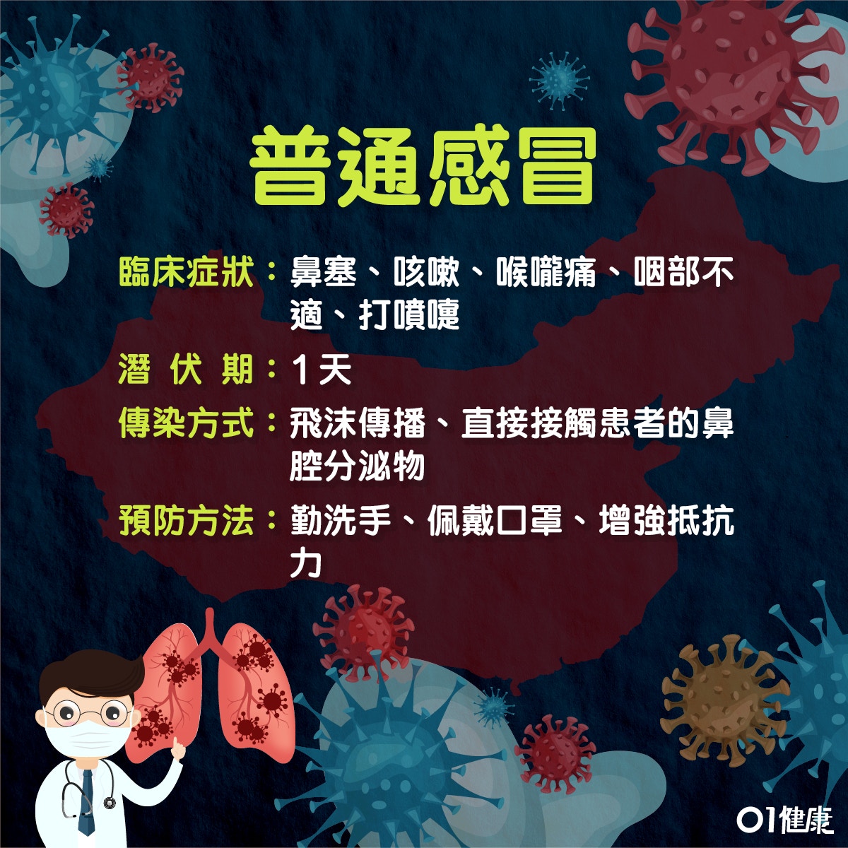 普通感冒:症狀為鼻塞、流鼻涕等,多數患者症狀較輕,一般不引起肺炎症狀。