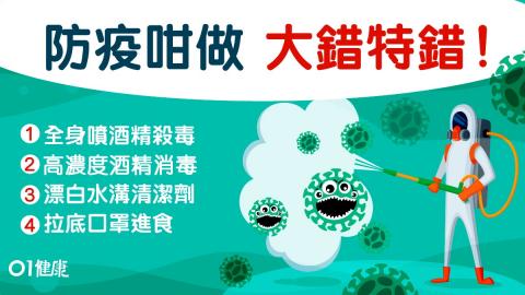 新型冠狀病毒疫情持續,人人出盡法寶抗疫,聲稱可抵禦武漢肺炎的防疫方法滿天飛,例如在家都要不時噴灑消毒酒精,又或是以熱水稀釋漂白水的消毒效果會更佳。疫情下眾說紛紜,究竟哪些是正確、哪些是錯?一起總結一下錯誤的防疫方法,別要「好心做壞事」,適得其反!