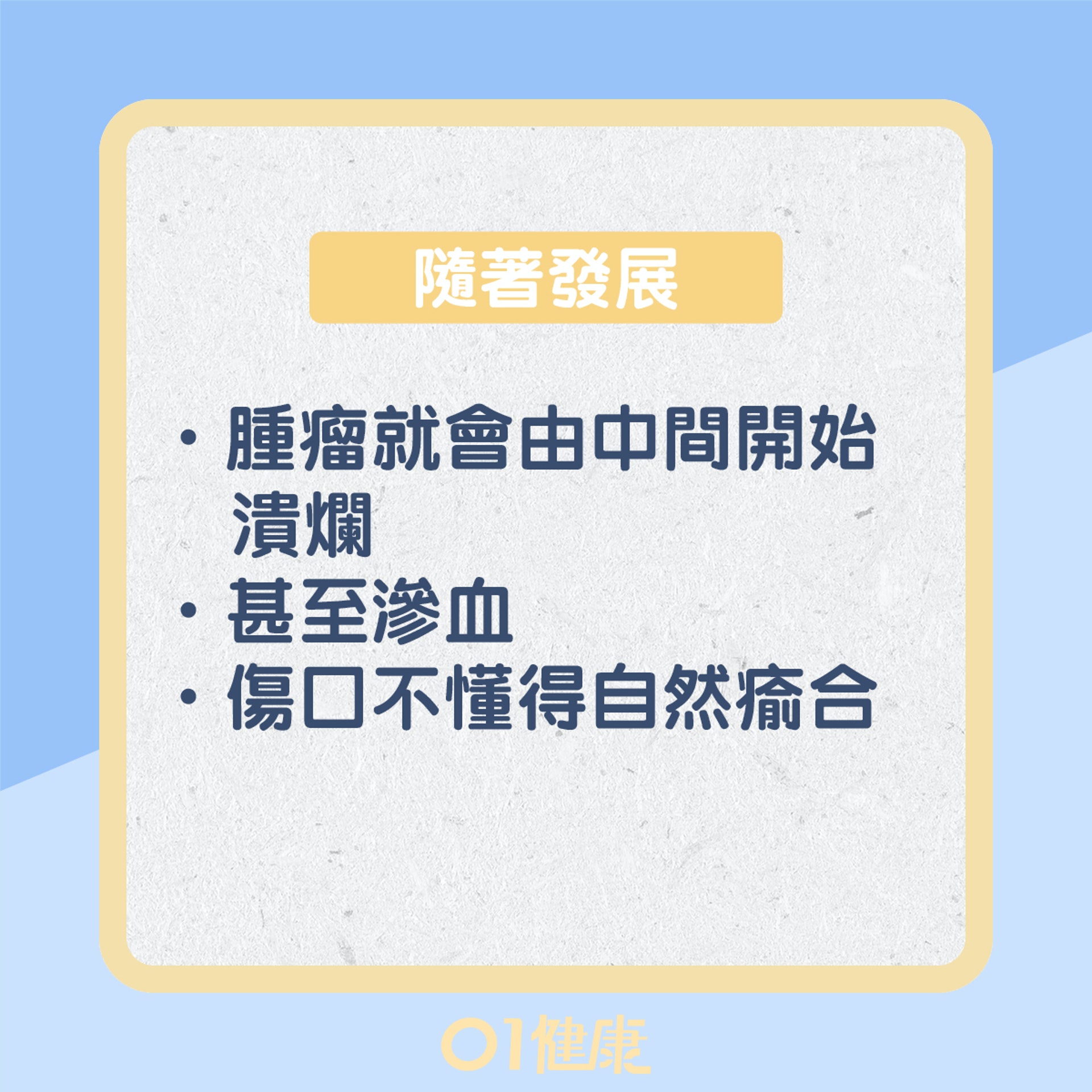 初期的基底細胞皮膚癌,皮膚會呈現一塊紅斑,它的邊界可以是突起的,甚至會見到結節和腫瘤。隨著發展, 腫瘤就會由中間開始潰爛,甚至乎滲血,傷口不懂得自然瘉合。